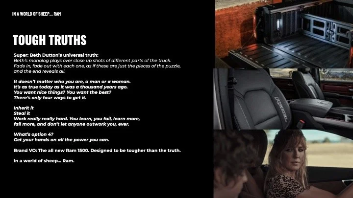 Beth Dutton has many iconic scenes. We proposed taking an existing scene, reshooting it in a Ram, and of course editing for um, language, and timing. Both ideas come under ‘In a world of sheep… Ram.’ She is an unexpected, undeniable Ram.
